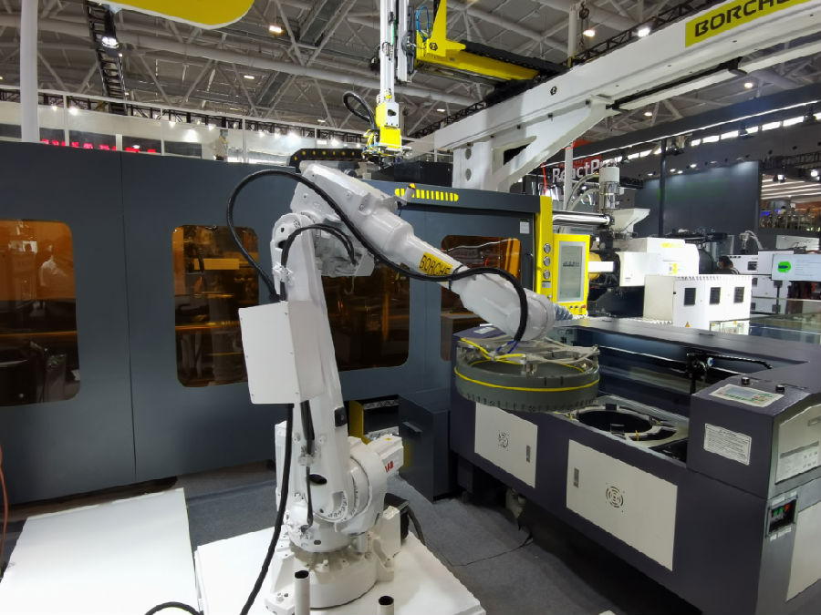 作為二板智能注塑機專家,博創(chuàng)在CHINAPlAS 2021上展示全新的、顛覆行業(yè)的洗衣機平衡環(huán)智能注塑生產(chǎn)系統(tǒng)。該系統(tǒng)以BM500-3C兩板式水平對射三色機為主機集成多個自動化設(shè)備形成注塑島??梢栽谌藱C交互界面(電腦)上實現(xiàn)注塑島輔助設(shè)備(冷水機、模溫機、機械手)的操作。進行注塑單元智能互聯(lián)形成智能注塑無人化生產(chǎn)線實現(xiàn)多工序制品的注塑。機械手取件、CCD檢測水口、切除水口、機器人搬運、氣密性檢測、碼垛。