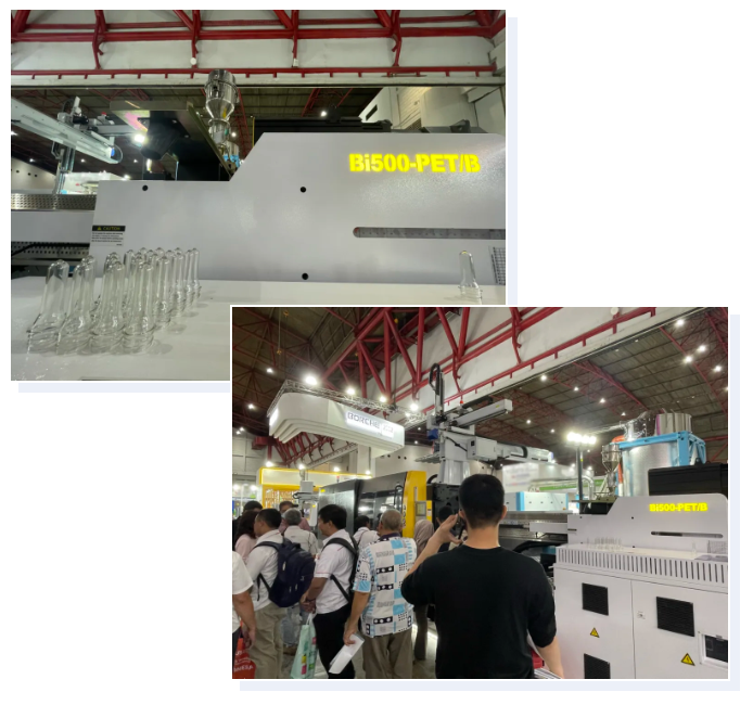 博創(chuàng)展位號(hào)A1-2102其中,以Bi500-PET/B為主體的瓶胚智能包裝生產(chǎn)線,生產(chǎn)14克的瓶胚,一出64,每模僅需要12秒,獲得客戶的高度認(rèn)可,市場(chǎng)需求火熱。