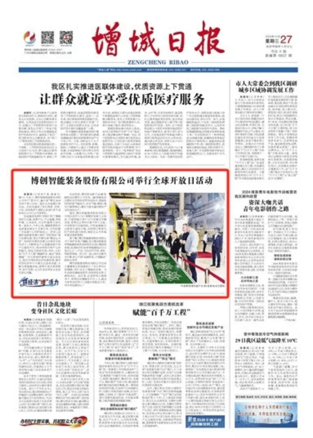 11月26日,博創智能裝備股份有限公司舉行“數智化,贏未來”博創2024全球開放日活動。副區長吳金城出席活動。活動還邀請了來自歐洲、非洲、中東、亞洲等多個國家以及國內多個省份的企業與行業代表參加。